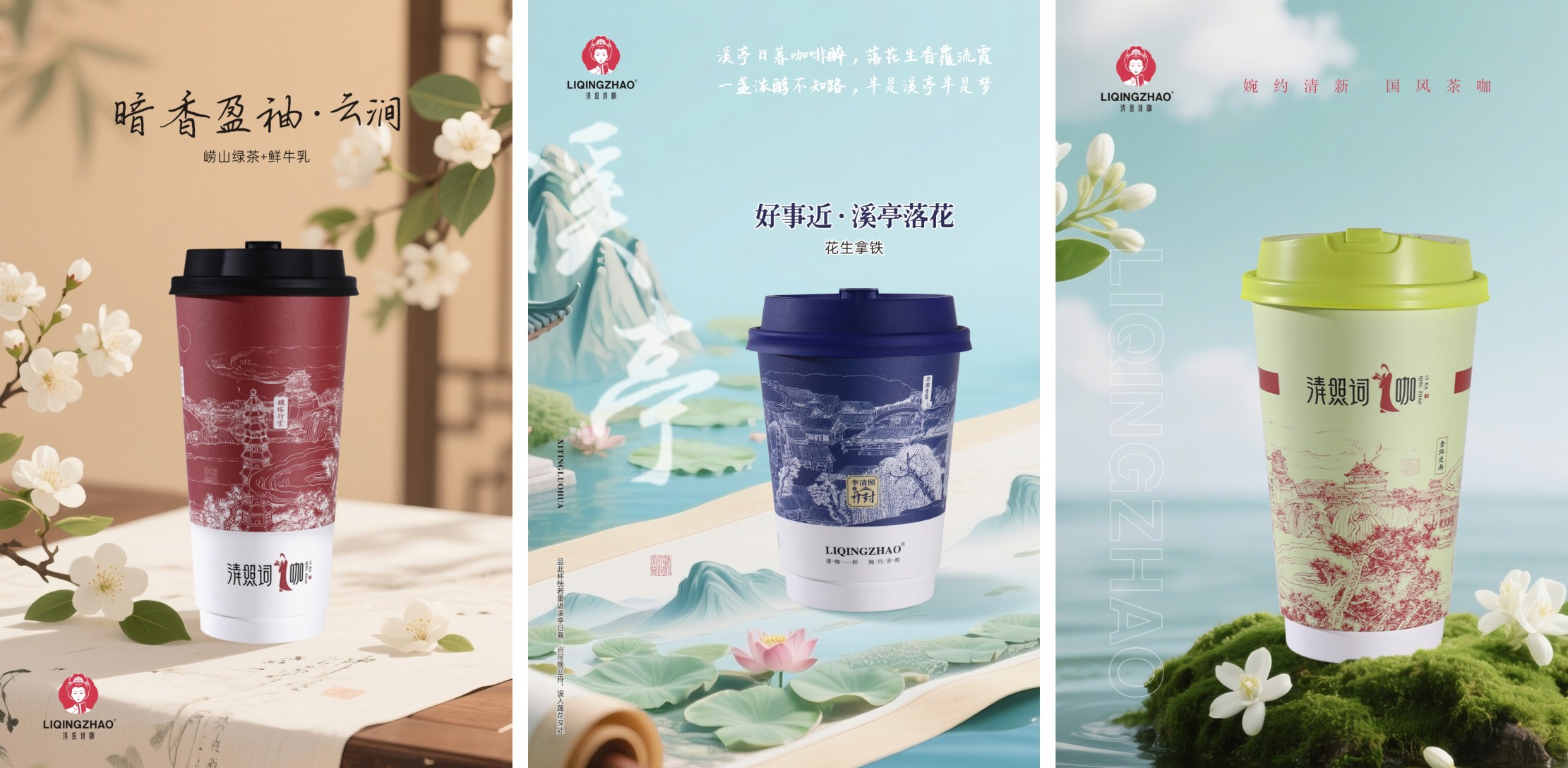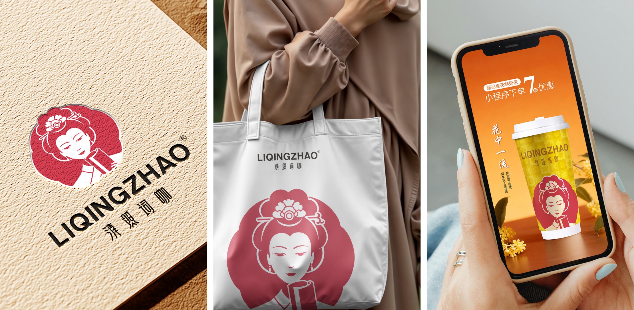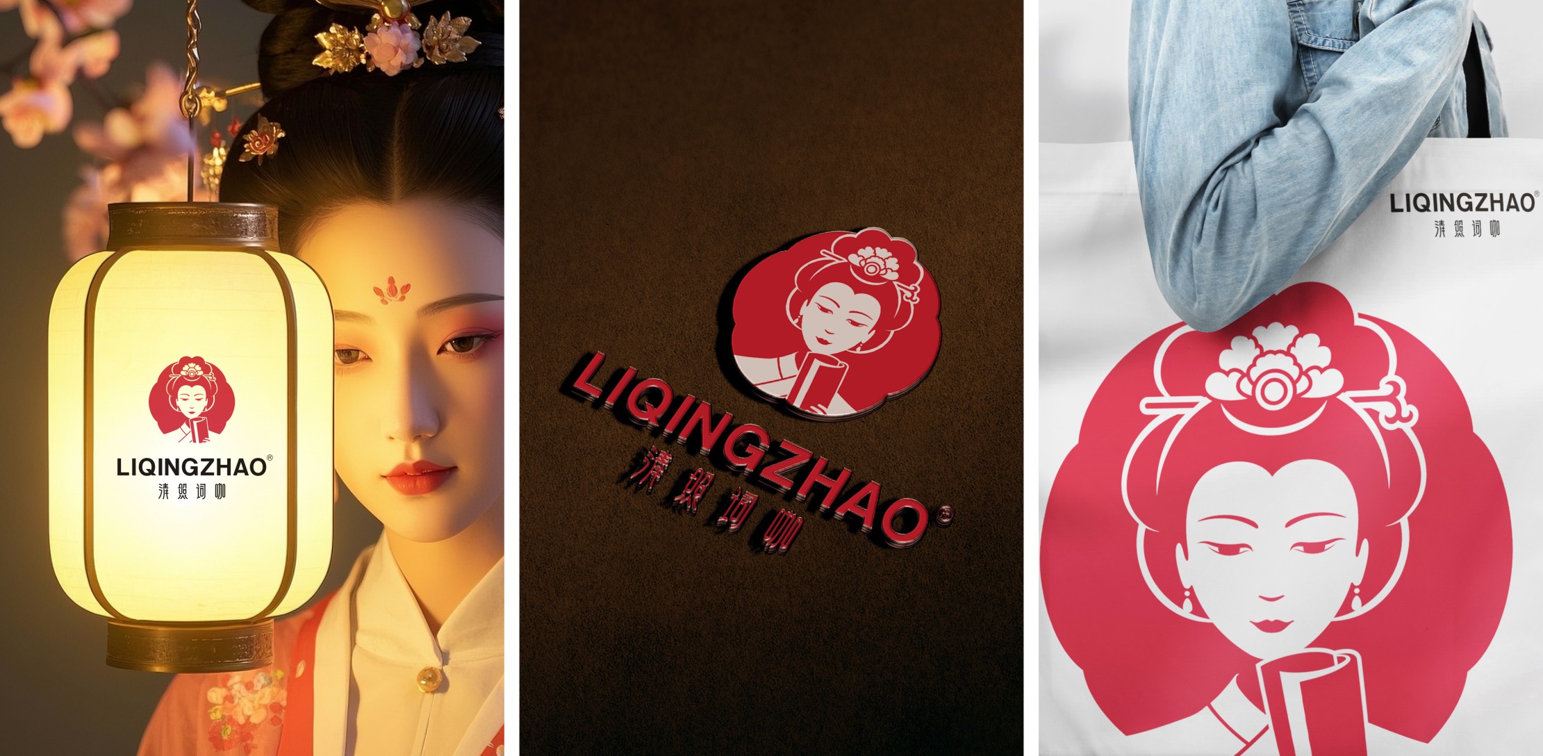 「清照词咖」婉约清新丨国风茶饮,以古代第一网红-才女李清照的文化 IP 为核心,将婉约词韵与东方美学深度融入茶饮品牌,构建出 “一杯清咖,半阙词香” 的沉浸式国风消费体验,让传统美学在当代茶饮场景中焕发新生。 品牌 LOGO 以李清照经典形象为视觉锚点,采用剪纸艺术的极简线条,勾勒出宋代仕女温婉娴静的神态:高挽的发髻、精致的花钿、手持书卷的姿态,精准还原了 “千古第一才女” 的婉约气质。 色彩上选用朱砂红作为主色,既呼应宋代美学的雅致,又传递出品牌的文化温度与辨识度; 英文「LIQINGZHAO」与中文「清照词咖」的字体设计,兼顾了现代品牌的识别性与东方书法的韵律感,刚柔并济; 文化赋能,差异化破局 本次设计的核心,是将李清照的文化 IP 与茶饮品牌深度绑定,跳出传统茶饮的同质化竞争: 以宋代美学为基底,融合现代设计语言,打造 “婉约清新” 的品牌调性,精准匹配国风茶饮的消费需求; 全链路视觉统一,从 LOGO 到空间、产品、周边,构建完整的品牌视觉体系,强化品牌辨识度; 以文化为内核,让茶饮不止于口感,更成为东方美学与宋词文化的传播载体,实现 “品一杯茶,读一首词” 的消费体验,为清照词咖打造差异化的国风茶饮品牌形象。