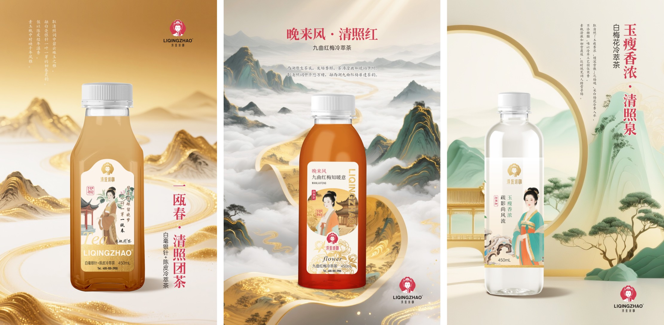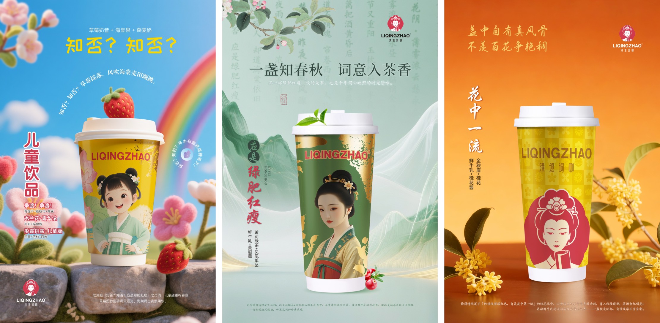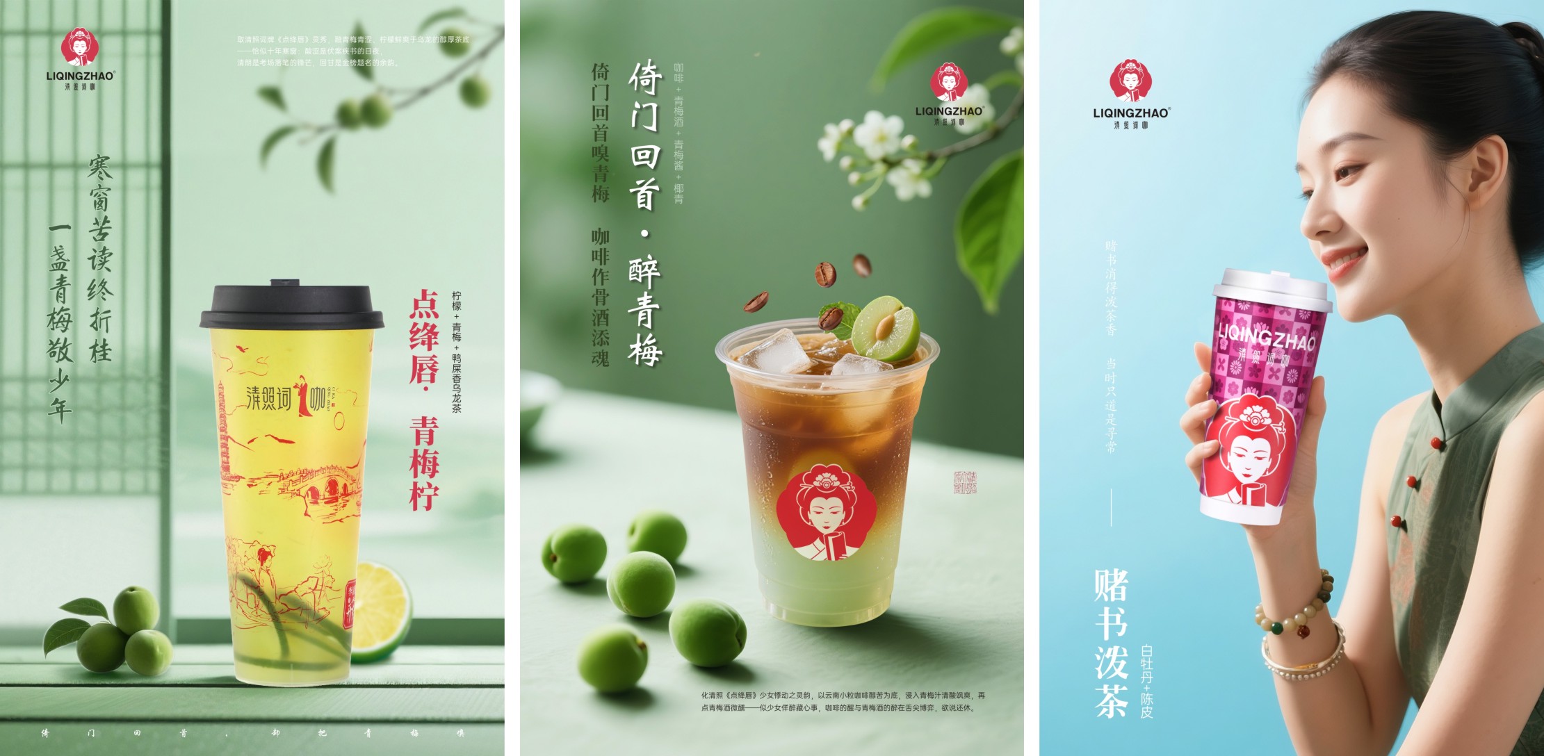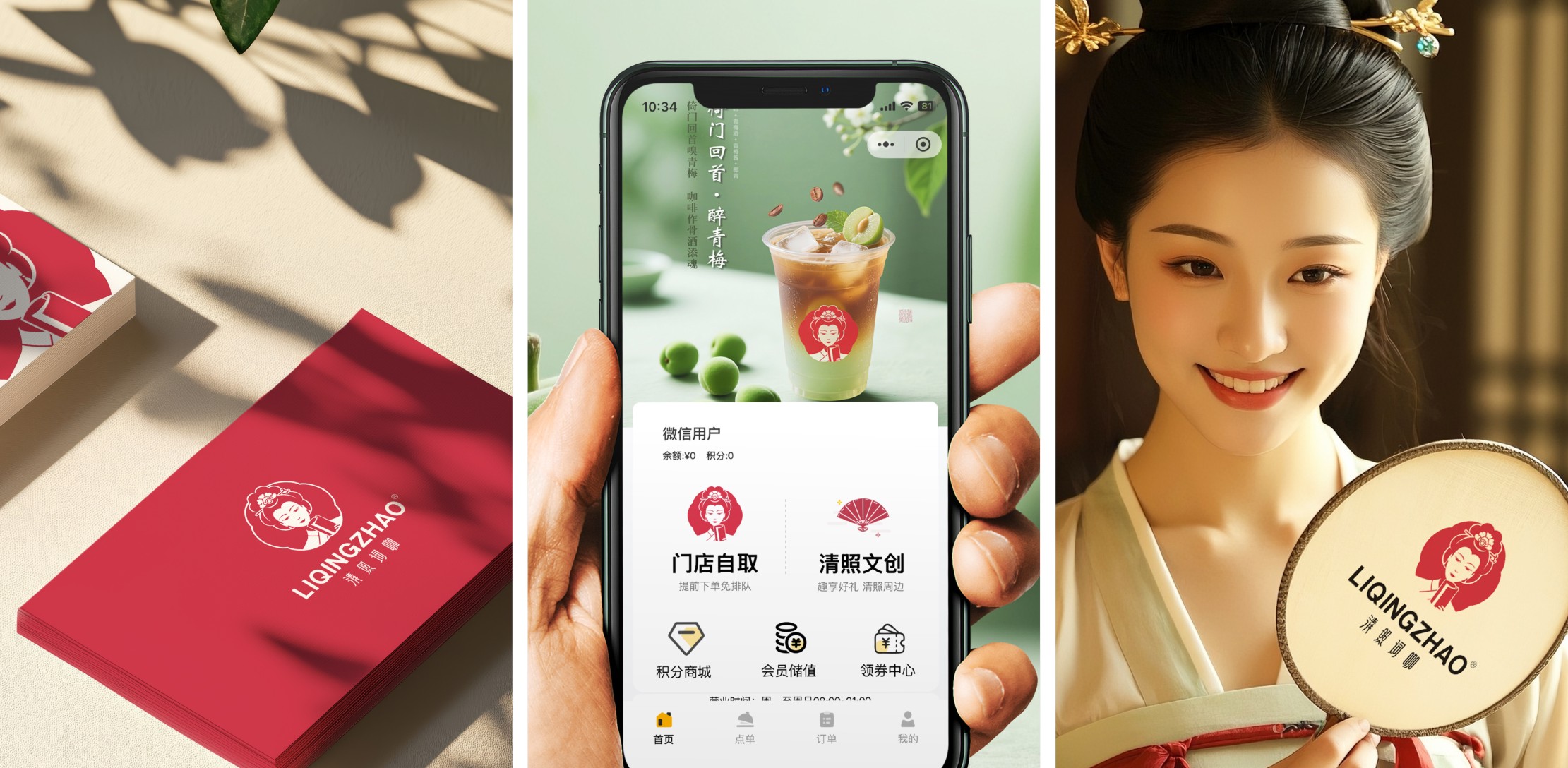 「清照词咖」婉约清新丨国风茶饮,以古代第一网红-才女李清照的文化 IP 为核心,将婉约词韵与东方美学深度融入茶饮品牌,构建出 “一杯清咖,半阙词香” 的沉浸式国风消费体验,让传统美学在当代茶饮场景中焕发新生。 品牌 LOGO 以李清照经典形象为视觉锚点,采用剪纸艺术的极简线条,勾勒出宋代仕女温婉娴静的神态:高挽的发髻、精致的花钿、手持书卷的姿态,精准还原了 “千古第一才女” 的婉约气质。 色彩上选用朱砂红作为主色,既呼应宋代美学的雅致,又传递出品牌的文化温度与辨识度; 英文「LIQINGZHAO」与中文「清照词咖」的字体设计,兼顾了现代品牌的识别性与东方书法的韵律感,刚柔并济; 文化赋能,差异化破局 本次设计的核心,是将李清照的文化 IP 与茶饮品牌深度绑定,跳出传统茶饮的同质化竞争: 以宋代美学为基底,融合现代设计语言,打造 “婉约清新” 的品牌调性,精准匹配国风茶饮的消费需求; 全链路视觉统一,从 LOGO 到空间、产品、周边,构建完整的品牌视觉体系,强化品牌辨识度; 以文化为内核,让茶饮不止于口感,更成为东方美学与宋词文化的传播载体,实现 “品一杯茶,读一首词” 的消费体验,为清照词咖打造差异化的国风茶饮品牌形象。