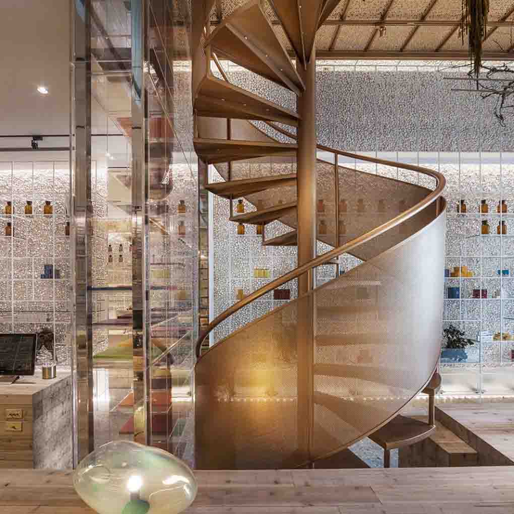 没有哪家药店会在你走的时候说“欢迎再来”,除了这家台湾的“分子药局”。走进去即被眼前现代前卫的设计震撼到,高挑的亚克力货架,鹅卵石墙面,用老树干做底、点缀着树枝和苔藓的实验平台,还有现代气息十足的黄铜旋转楼梯,咖啡区、艺文区……简直无法相信这是药店!实际上它跟传统意义上的药店的确不一样,更侧重健康保健、休闲体验,三位年轻药剂师会为客人提供健康咨询服务,比起“药店”来,似乎“轻药店”“健康选物店”“绿色休闲空间”更适合它。
